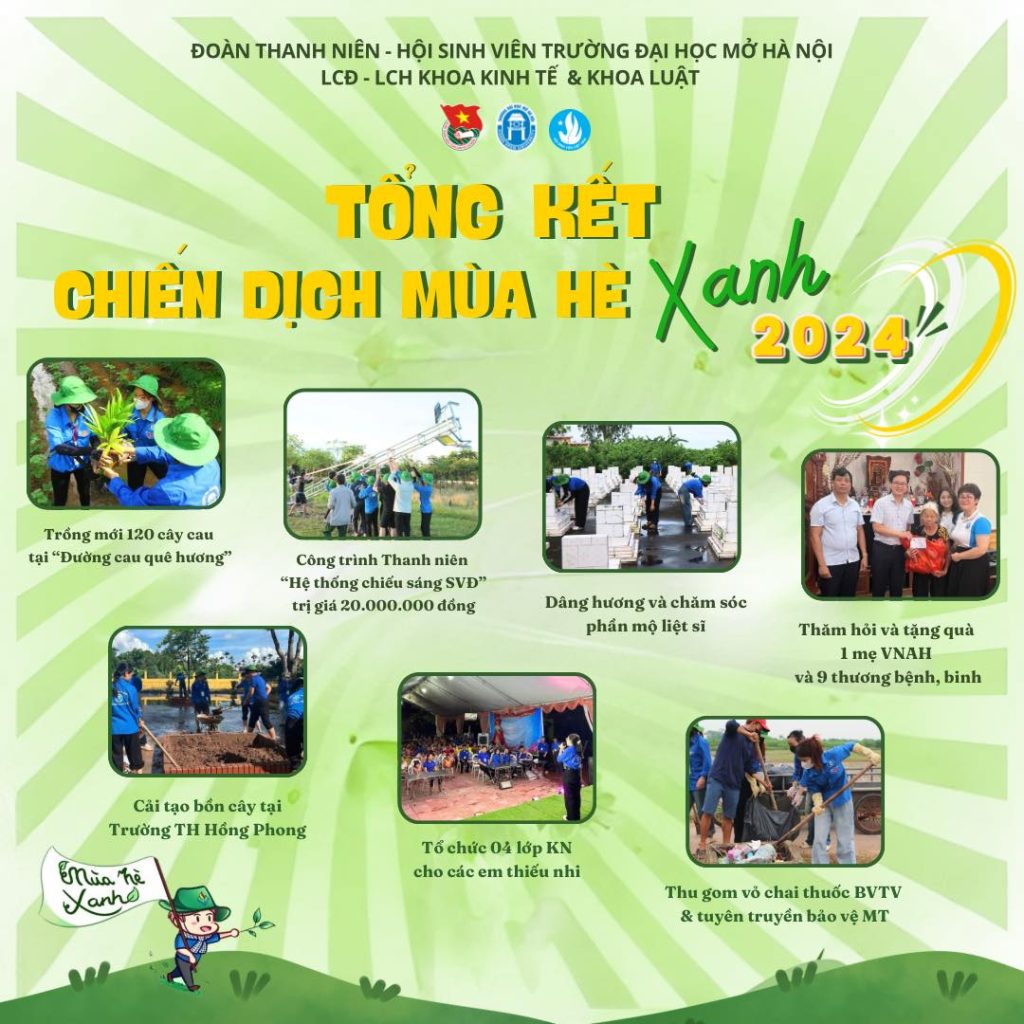 Sau 10 ngày hoạt động tràn đầy nhiệt huyết vànăng lượng, chiến dịch Mùa Hè Xanh năm 2024 do LCĐ Khoa Kinh tế và Khoa Luật trường Đại học Mở Hà Nội phát động tại địa bàn xã Hồng Phong, huyện Vũ Thư, tỉnh Thái Bình đã chính thức khép lại với vô vàn những kỷ niệm khó quên.